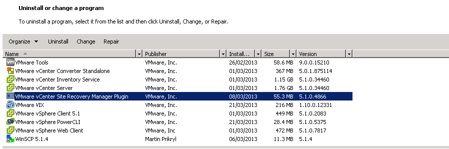 13. Once installation is complete, you will need to upgrade the vSphere Client Plug-in for SRM. You will need to uninstall the old SRM plug-in from within Windows Control Panel->Programs.