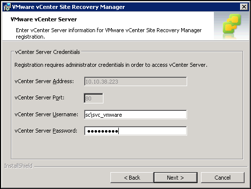 4. Enter the vCenter Server credentials (the installer will notice SRM is already installed and pick up the IP address of the vCenter Server).