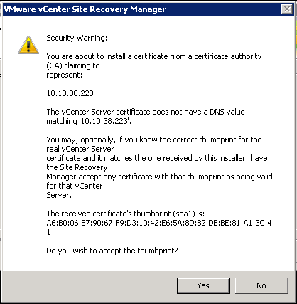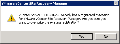 6. Once the installer connects to your vCenter Server, it will identify that you already have a registered extension for SRM. Click Yes to overwrite the old extension.