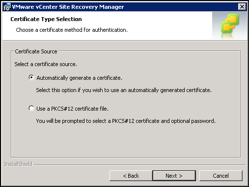 7. Select the type of authentication to be used (in my case I’m letting SRM auto-generate a self-signed certificate).