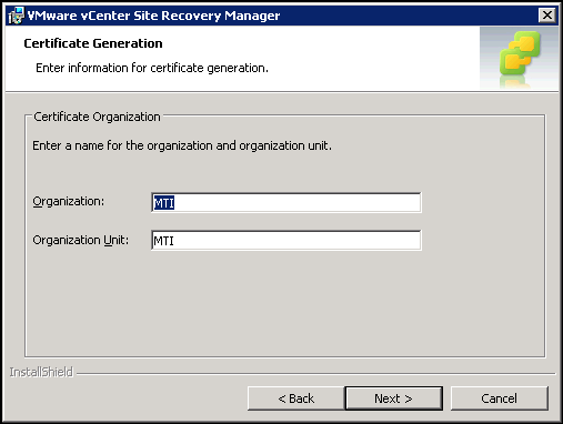 8. Enter the Organisation and OU in order for SRM to generate the certificate.