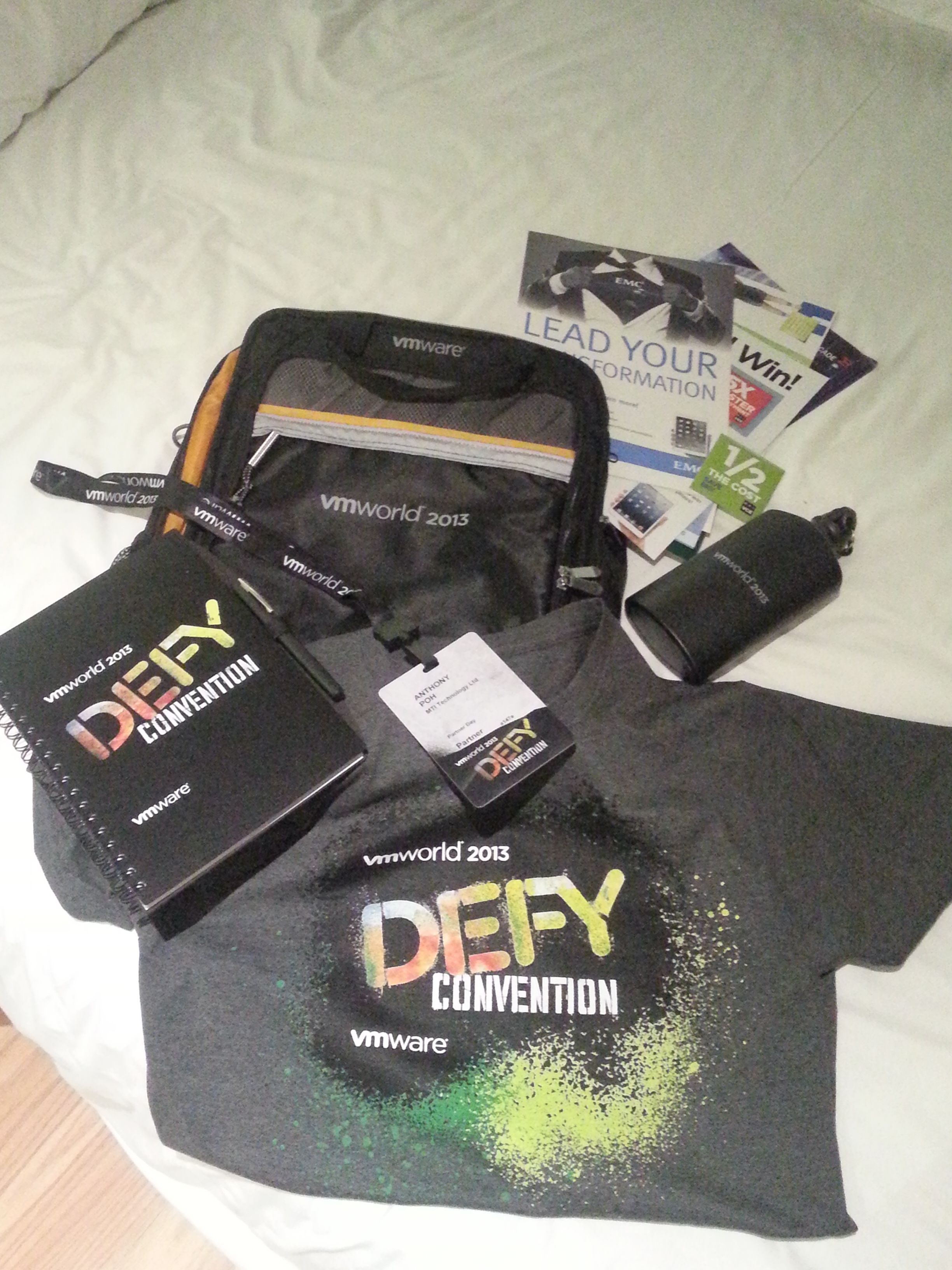 A pretty handy laptop bag with the usual load of flyers inside, plus a VMworld t-shirt, notepad and water bottle (obviously to keep us delegates hydrated as we salivate when finding out about all the new stuff being announced!)