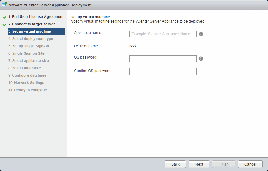 Accept the EULA and enter the ESXi host information where you are going to deploy the vCSA, accept any certification warnings: