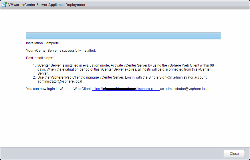 Once complete, the installation wizard will give you the details to connect to the web client, the URL will be https://fqdn/vsphere-client (no more port number required at the end of the url!!). Remember, if you’ve changed the SSO domain earlier, then the login user will be administrator@SSO-Domain