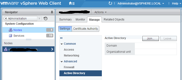 Click OK to join the vCenter Server Appliance to the Active Directory domain. Now Right-click the node you edited and select Reboot to restart the appliance so that the changes are applied.