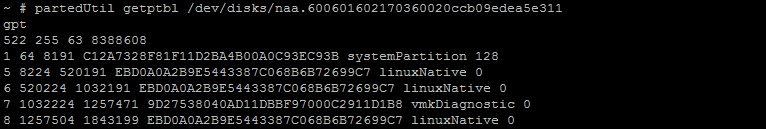 partedUtil getptbl “/dev/disks/DeviceName”