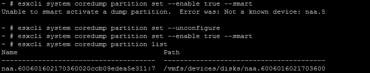 esxcli system coredump partition set –enable true –smart